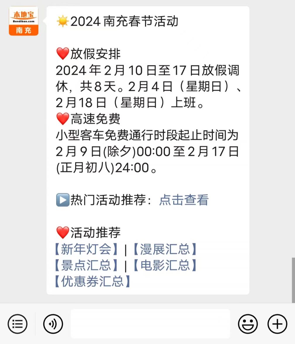 温馨提示:微信搜索公众号【南充本地宝】,关注后在对话框回复【春节】可获取2024春节放假时间日历、春节灯会/烟花秀/民俗演出/景点活动/电影/优惠券等汇总。